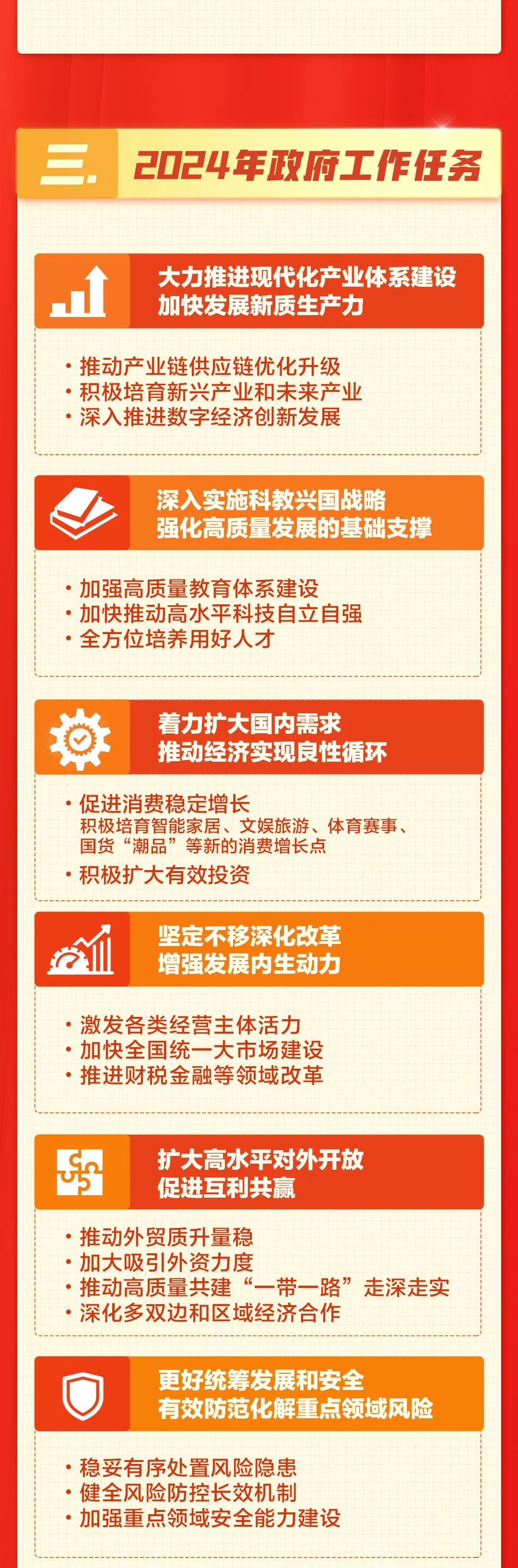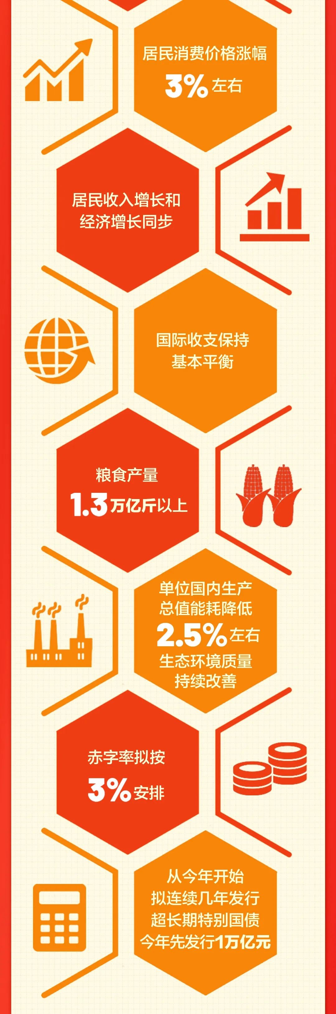 3月5日,李强总理向十四届全国人大二次会议作政府工作报告,要点如下:一、2023年工作回顾 国内生产总值增长5.2% 粮食产量1.39万亿斤 城镇新增就业1244万人 全年新增税费优惠超过2.2万亿元 新能源汽车产销量占全球比重超过60% 电动汽车、锂电池、光伏产品“新三样”出口增长近30%二、今年主要预期目标 国内生产总值增长5%左右 城镇新增就业1200万人以上 居民消费价格涨幅3%左右 粮食产量1.3万亿斤以上 单位国内生产总值能耗降低2.5%左右三、今年部分重点工作 财政:赤字率拟按3%安排。一般公共预算支出比上年增加1.1万亿元 政府投资:拟安排地方政府专项债券3.9万亿元。中央预算内投资拟安排7000亿元 特别国债:从今年开始拟连续几年发行超长期特别国债,专项用于国家重大战略实施和重点领域安全能力建设,今年先发行1万亿元 未来产业:开辟量子技术、生命科学等新赛道 数字经济:开展“人工智能+”行动 消费:鼓励和推动消费品以旧换新,提振智能网联新能源汽车、电子产品等大宗消费 住房:加大保障性住房建设和供给,完善商品房相关基础性制度 就业:要强化促进青年就业政策举措。分类完善灵活就业服务保障措施 乡村振兴:在全国实施三大主粮生产成本和收入保险政策。加强充电桩、冷链物流、寄递配送设施建设 城镇化:稳步实施城市更新行动。推动解决老旧小区加装电梯、停车等难题 教育:开展基础教育扩优提质行动。推动学前教育普惠发展 医保:居民医保人均财政补助标准提高30元 社会保障:城乡居民基础养老金月最低标准提高20元,继续提高退休人员基本养老金。在全国实施个人养老金制度。多渠道增加托育服务供给 开放:全面取消制造业领域外资准入限制措施,放宽电信、医疗等服务业市场准入。提升外籍人员来华工作、学习、旅游便利度 环保:完善支持绿色发展的财税、金融、投资、价格政策和相关市场化机制